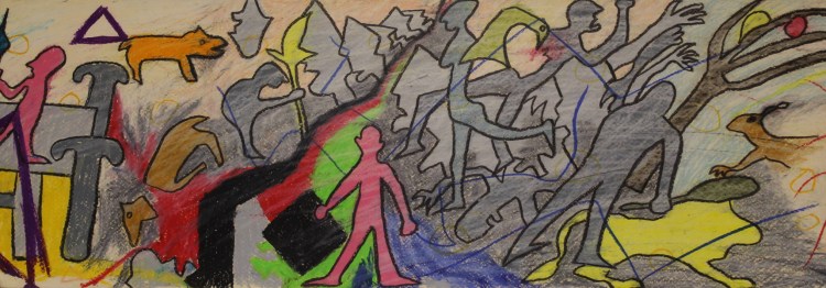 Baltiswiler created a massive conceptual art work “The Survival Plan”/ “Der Überlebensplan”, which was 8 meters long and 1.2 meters high. He had worked on it for several months. He could realise this huge work in the workshop for graphic design, in the academy. It was meant as a continuation to the “Odysseus” painting he had made one year earlier, in Zurich. It also dealt with different aspects of life. When he presented his new work to his class together with Fritz Schwegler, nobody understood it.