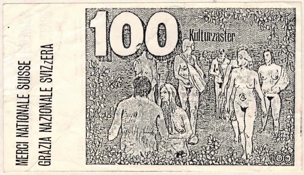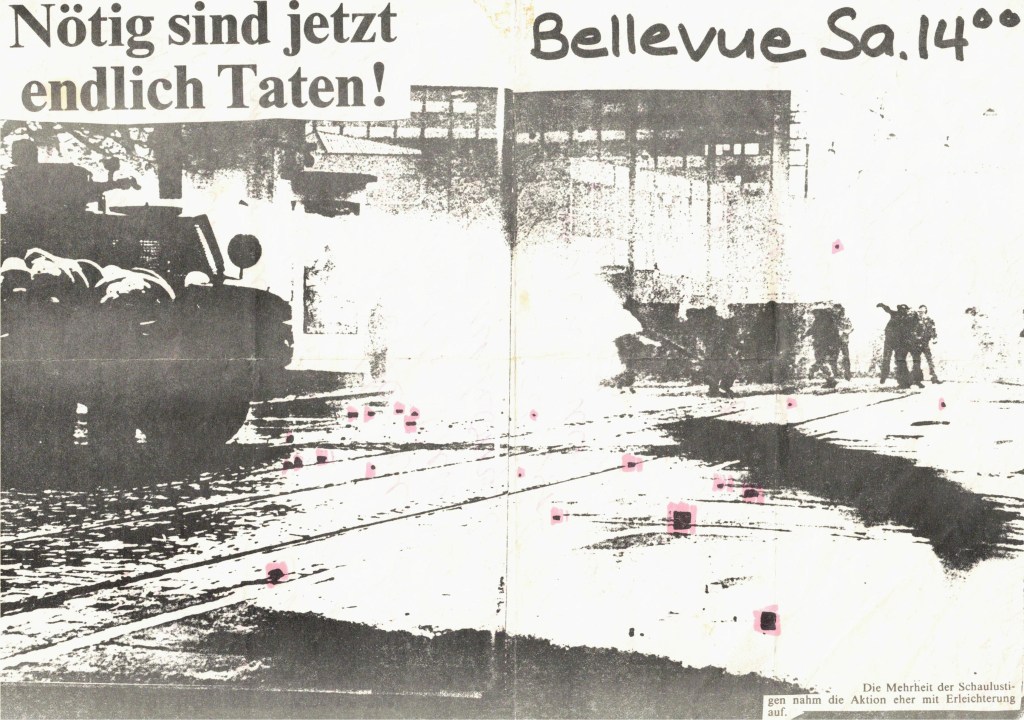 “Many demonstrations however were peaceful and full of humour, like the one when all the demonstrators were walking naked and on another occasion, the demonstration took place swimming in the river Limmat in the middle of the town. Xerox fliers were frequently printed like the ones titled “Macht Gurkensalat aus dem Staat” which means “Make cucumber salad out of the state” or “Freiheit für Grönland” which means “Freedom for Greenland”.