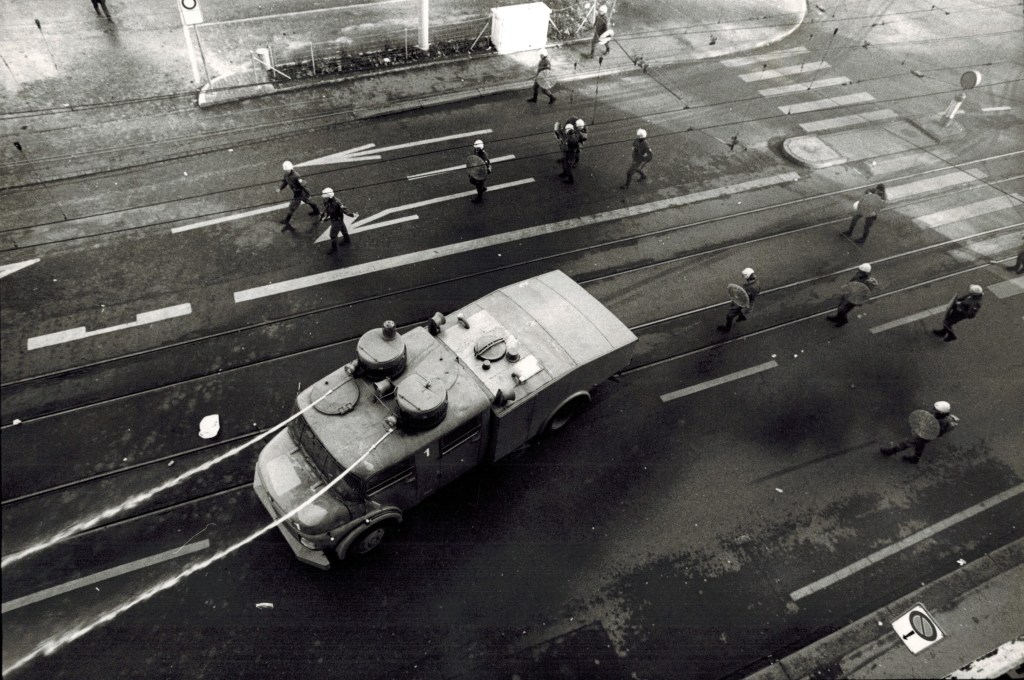 “When I moved to Zurich at the beginning of 1981 the youth protest movement “Zurich Opera House Riots” was in full swing. I became part of the movement and we called it “Bewegig” which simply means “movement”. The riots started in May 1980 as protests against the extremely high subsidies for the Zurich Opera by the city, while alternative cultural programs for the youth were completely neglected. Many young people felt that the line had been crossed and they wanted to express their frustration by demonstrating. There was at least one demonstration every week. Many were very humorous but some were violent. It was a very special atmosphere. On the one hand, there was a highly creative spirit among young people and on the other hand, there was a lot of police brutality and repression from the politicians who were unable to manage the situation. Several young people lost an eye from rubber bullets shot by the police.