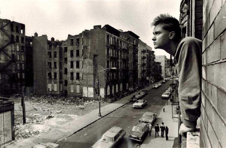 “I didn’t know if I should take the apartment or not since the Lower East Side was a dangerous area. But the little loft was so beautiful that I couldn’t resist. I could see the tops of the World Trade Centre but the neighbourhood outside looked like a war zone, with all the burned and ruinous houses. Junkies around the corner tried to sell me all kinds of drugs. It was a Puerto Rican area. People were speaking Spanish. You could hear the salsa music from the “ghetto blasters”. The entrance door to my house was full of gunshot holes. The Puerto Rican drug lord “Kojak” lived on the second floor and sold coke. I could only enter and leave the ghetto via 4th Street, where the gang knew me. When I passed the gang, they would shout “kikeriki” at me because of my mohawk haircut. Other gangs would have killed me if I had used their street. The gang members had no phones at that time. They would shout to a person nearby who would in turn, shout to the next. This was their communication system which worked very well for them. My white friends were so scared they didn’t even visit me during daytime, while my black friends would only visit me during daytime. You can imagine how scared I was when I came home late at night, passing the gang in my street and even more so, when I had spent all of my money on beers. The rule was that you needed to have at least 20 bucks on you, otherwise they would kill you.”