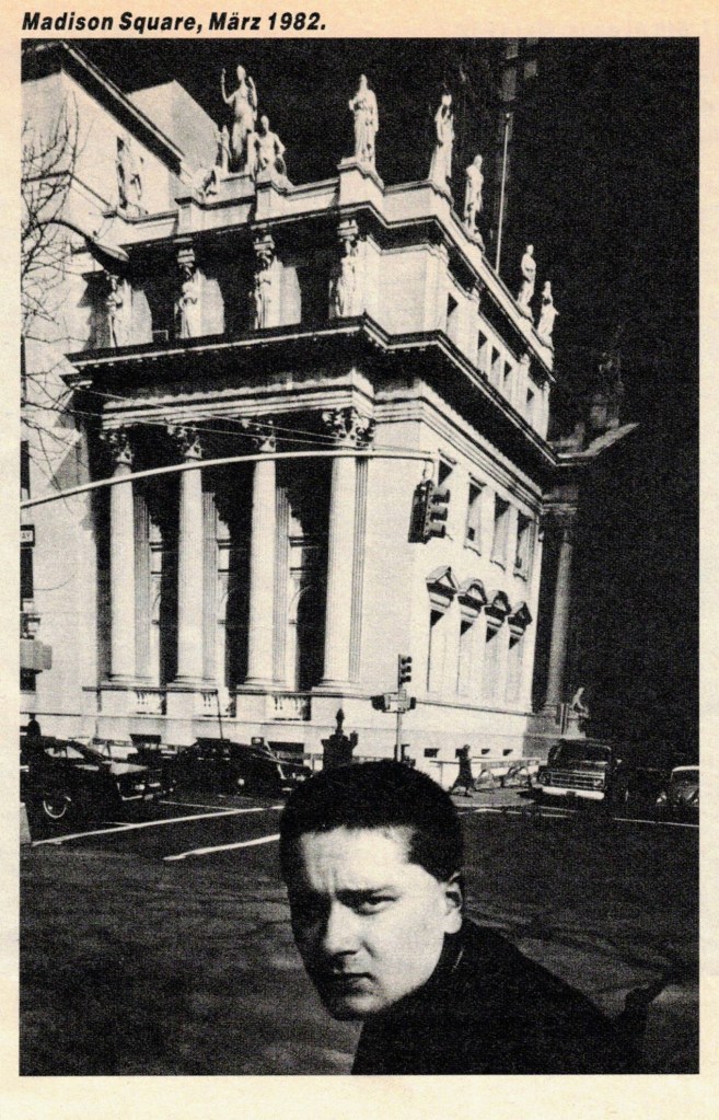 The tensions and riots with the police got harder and harder. One of Baltiswiler’s friends died after being beaten up so badly by the police. Baltiswiler wanted to leave this repressive milieu. His new idea was to live in a global city. He applied for the School of Visual Arts in New York and was accepted to start on January 25, 1982. By now, Baltiswiler’s own odyssey had started. He arrived in New York City January 21, shortly after his 21st birthday.