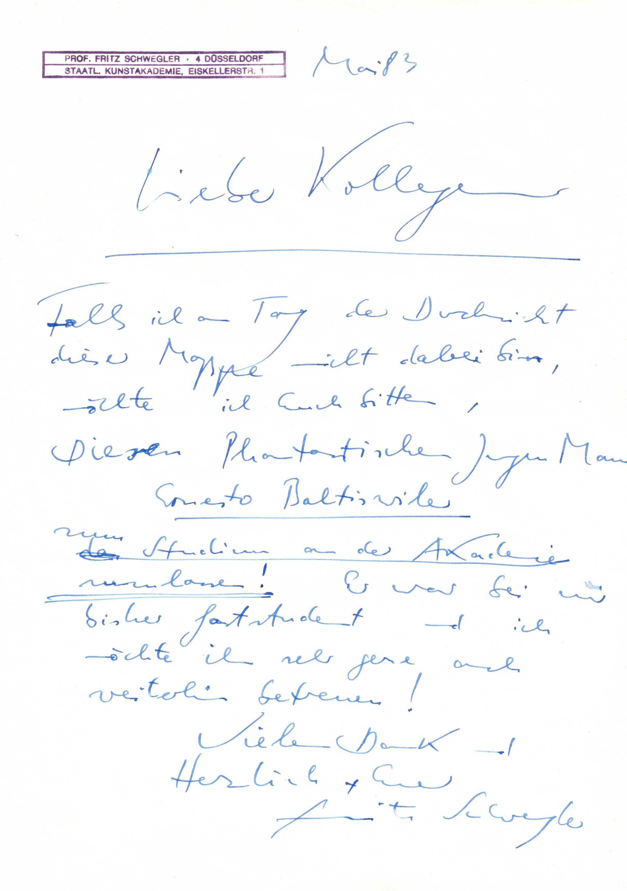 Fritz Schwegler about Ernesto Baltiswiler: “Liebe Kollegen”
